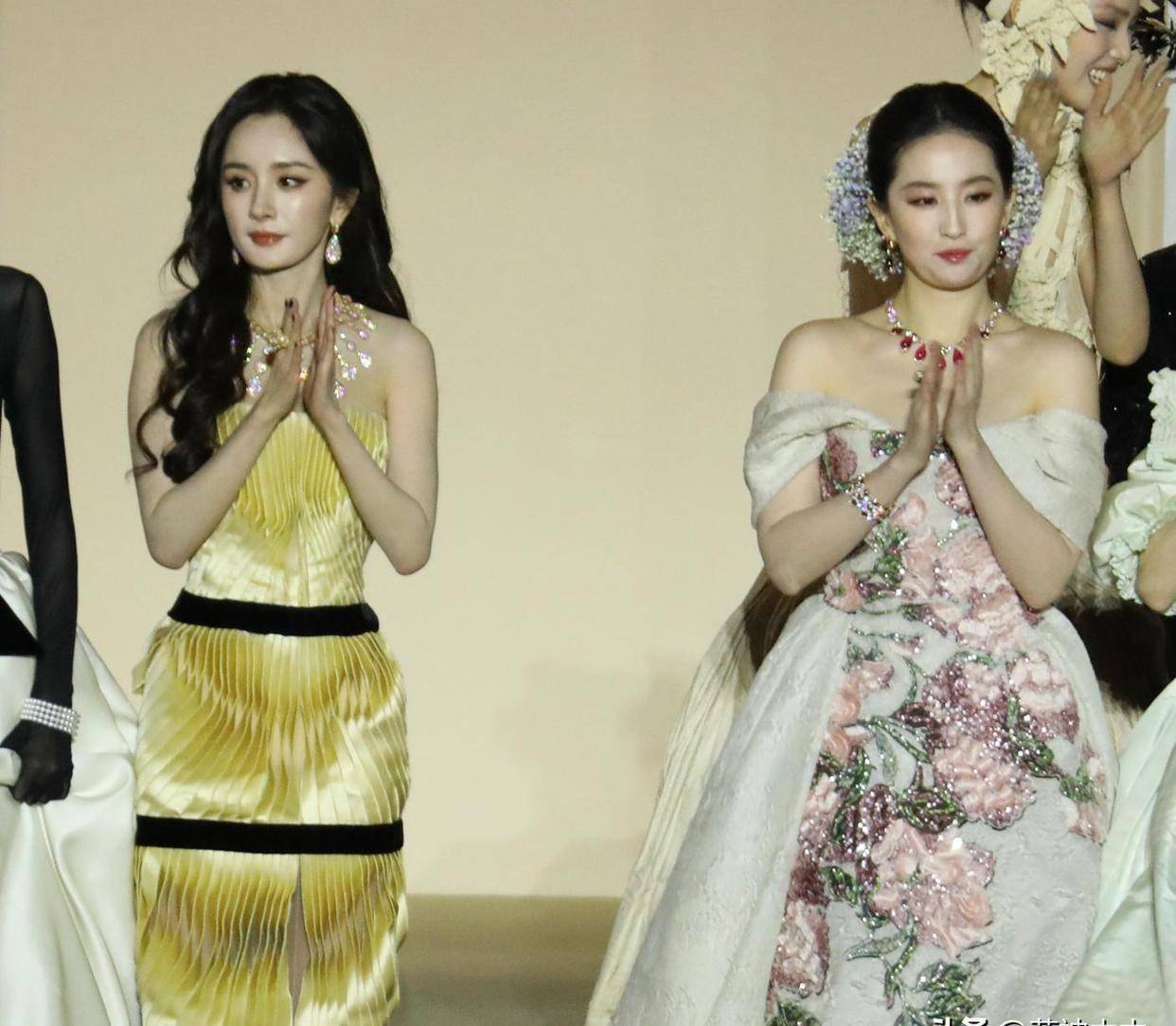 不过,随着同框画面的流出,网上却掀起了一阵“宫斗”猜测,甚至有营销号添油加醋说刘亦菲遭85花集体排挤,一会儿说她被抢占位置,一会儿说杨幂和刘诗诗冷落她,把瓜友们看得热血沸腾。可事实真的是这样吗?看完直播回放的细节,我真的要替刘亦菲喊冤!明明当刘亦菲刚走上红毯时,杨幂和刘诗诗就立刻起身挥手打招呼,眼神里满是欣赏,哪里来的冷落?所谓的“抢位风波”,不过是时尚圈和影视圈规则的小碰撞,钟楚曦穿古董高定想营造独特效果,刘亦菲则云淡风轻,哪怕裙摆被踩到也只是轻轻拉了拉,依旧笑靥如花,这份从容大气,可不是谁都能有的!